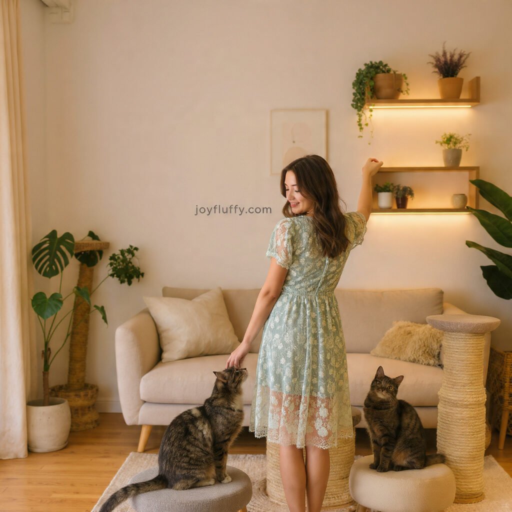 Safe low-light interior design ideas for indoor cats with a stylish young woman and cozy cat-friendly home.